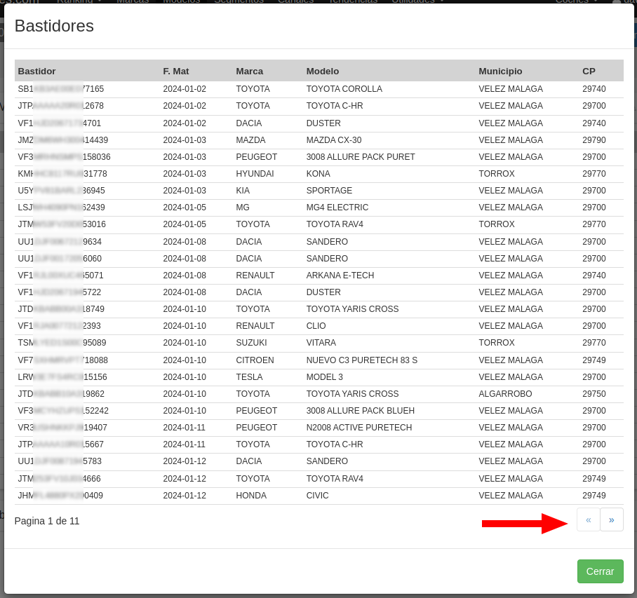 Si pinchamos sobre dicho número obtendremos la lista de los 252 bastidores junto con otra información como la Fecha de matriculación, Marca y Modelo del vehículo, municipio y código postal donde está domiciliado el vehículo.