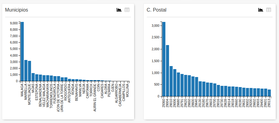 Una vez seleccionada una provincia se habilitarán 2 nuevos gráficos con los códigos postales y municipios de la provincia filtrada. Con estos dos gráficos ya podria seleccionar los municipios o códigos postales que desee filtrar.